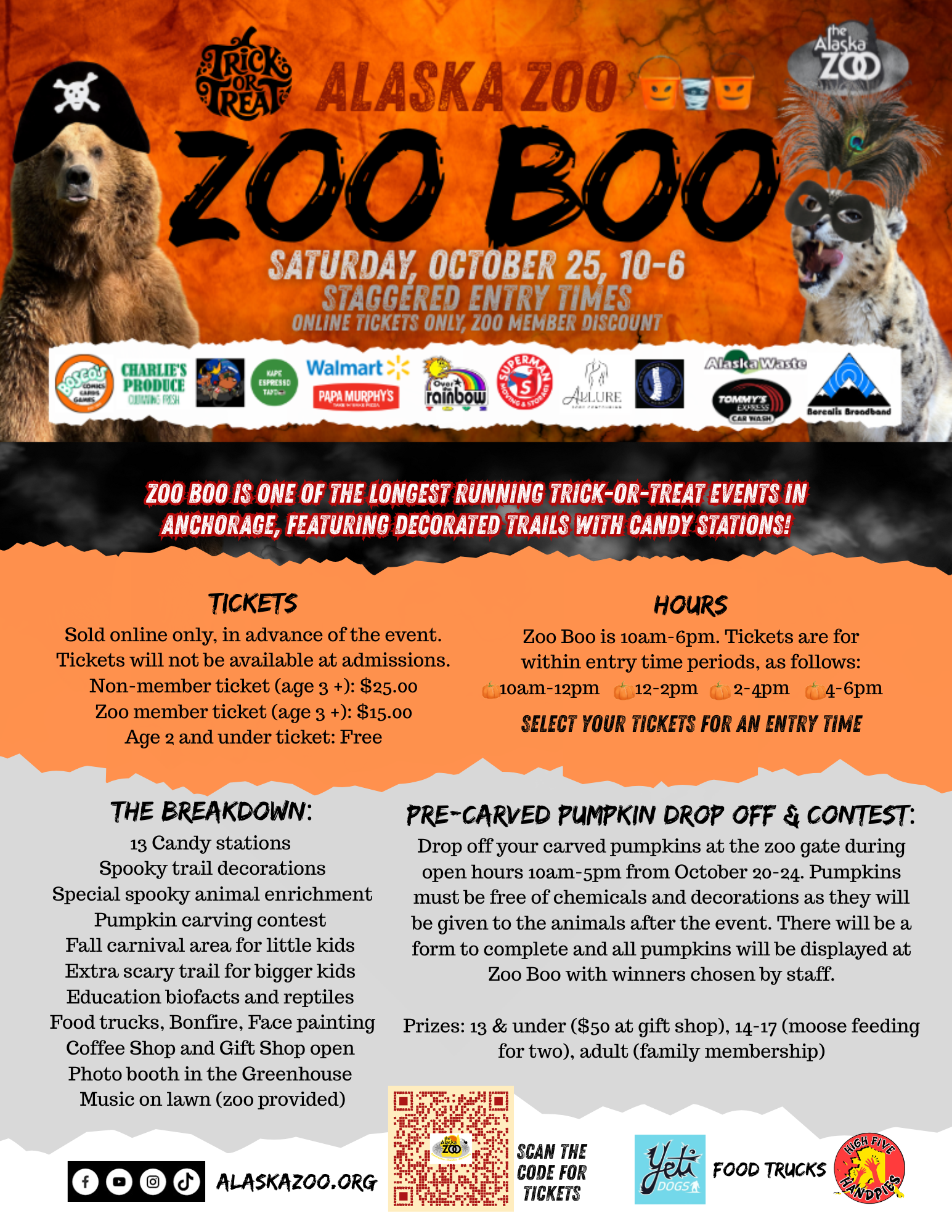 Zoo Boo at the Alaska Zoo features decorated trails with candy stations spread throughout zoo grounds, run by local business partners and zoo volunteers.
