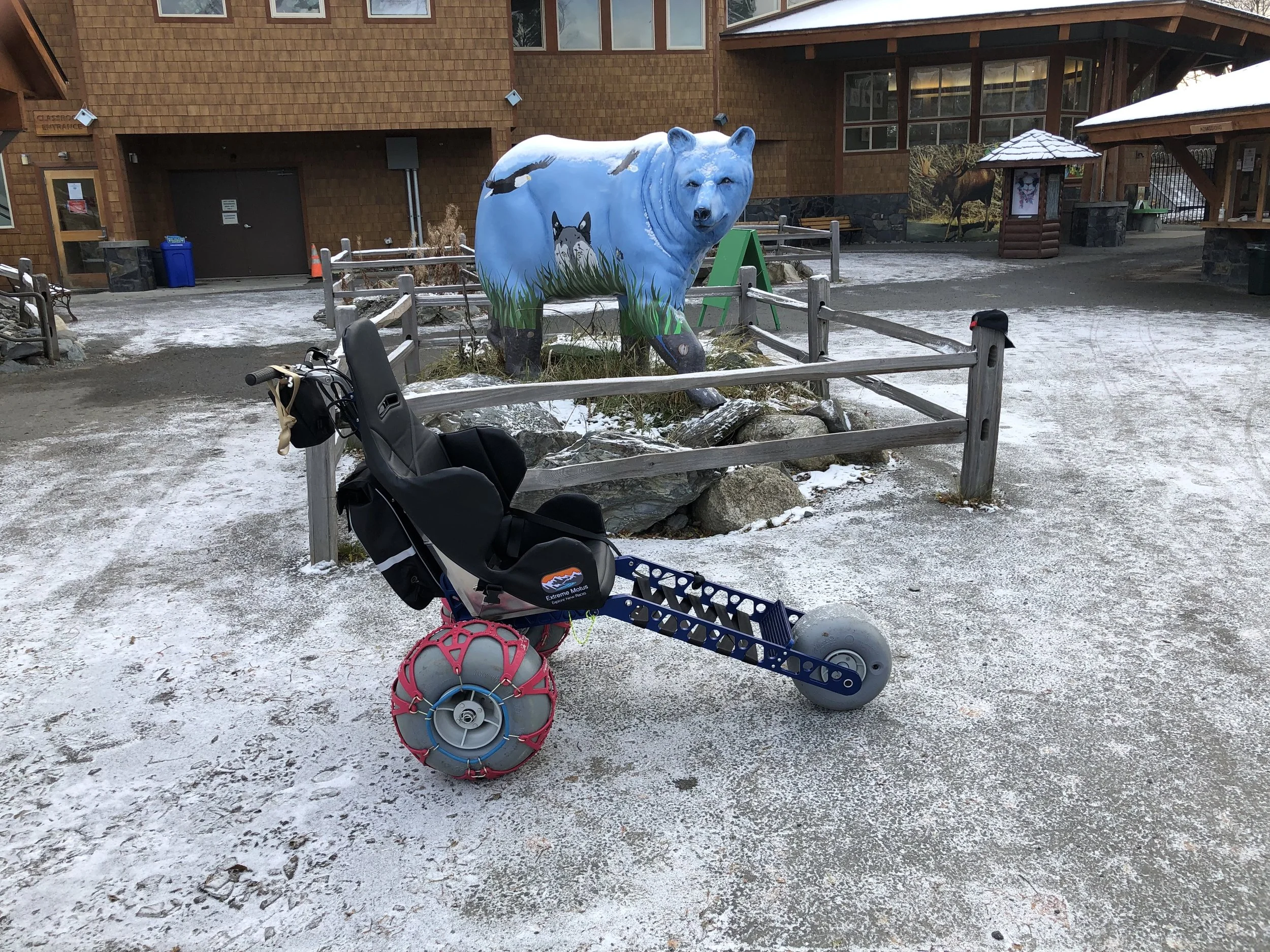 All-terrain Wheelchair: We have an all-terrain wheelchair available for use at the gate on a first-come basis. This wheelchair is not self-propelled, so a person will be needed to push it. It is designed for gravel trails like ours at the Alaska Zoo, but we caution that there can be areas of deeper gravel caused by recent weather events which may make the wheelchair more difficult to push. The wheelchair is pictured here.